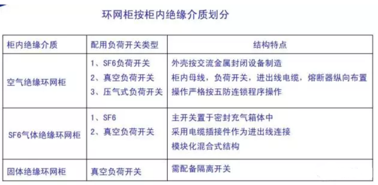 環(huán)網(wǎng)柜一般分為空氣絕緣和SF6絕緣兩種。柜體中,配空氣絕緣的負(fù)荷開(kāi)關(guān)主要有產(chǎn)氣式、壓氣式、真空式,配SF6絕緣的負(fù)荷開(kāi)關(guān)為SF6絕緣式,由于SF6氣體封閉在殼體內(nèi),它形成的隔斷斷口不可見(jiàn),通過(guò)增加觀察窗便于觀察。環(huán)網(wǎng)柜中的負(fù)荷開(kāi)關(guān),一般要求三工位,即切斷負(fù)荷,隔離電路、可靠接地。產(chǎn)氣式、壓氣式和SF6式負(fù)荷開(kāi)關(guān)易實(shí)現(xiàn)三工位,而真空滅弧室只能開(kāi)斷,不能隔離,所以一般真空負(fù)荷環(huán)網(wǎng)開(kāi)關(guān)柜在負(fù)荷開(kāi)關(guān)前再加上一個(gè)隔離開(kāi)關(guān),以形成隔離斷口。按柜內(nèi)絕緣介質(zhì)不同分為空氣型和六氟化硫型;