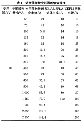 根據1989年國際配電網會議提供的資料,當油浸變壓器內發生短路故障時,短路電弧會使油氣形成氣泡而占據原先屬于油的空間,油將壓力傳給變壓器外璧,隨著短路的持續而壓力愈來愈大,直到油箱炸裂。要使油箱不被炸裂,必須在20ms內切除故障。斷路器的動作時間是保護動作時間和斷路器固有動作時間兩部分之和,其值不小于60ms,可見斷路器不能達到保護油浸變壓器的目的。負荷開關+熔斷器環網柜則能夠有效地保護變壓器,熔斷器保護變壓器的熔體選擇表1。
