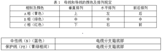 1)選用選用矩形母線,材料為T2電工銅。并選用不同相色熱縮套管做絕緣處理。熱縮套管不得開裂和起皺,母線接頭處用熱縮絕緣盒關閉。絕緣熱縮護套材料應具有阻燃、防腐、抗老化的要求,老化壽數不小于30年,具體試驗辦法和要求參照GB/T2951.14中規則實施。(2)銅排截面的挑選應確保能夠耐受IEC60298中引薦的額外短時耐受和峰值耐受電流的要求,N相(L0)母線與三相母線規范相同,PE排截面不低于相排截面的1/2。其間設于野外的低壓電纜分支箱配備4根母排(3L+PEN),設于戶內的低壓電纜分支箱配備5根母排(3L+N+PE)。(3)設備中母線和導線的色彩及擺放應契合GB/T4026GB7947及表1的規則;