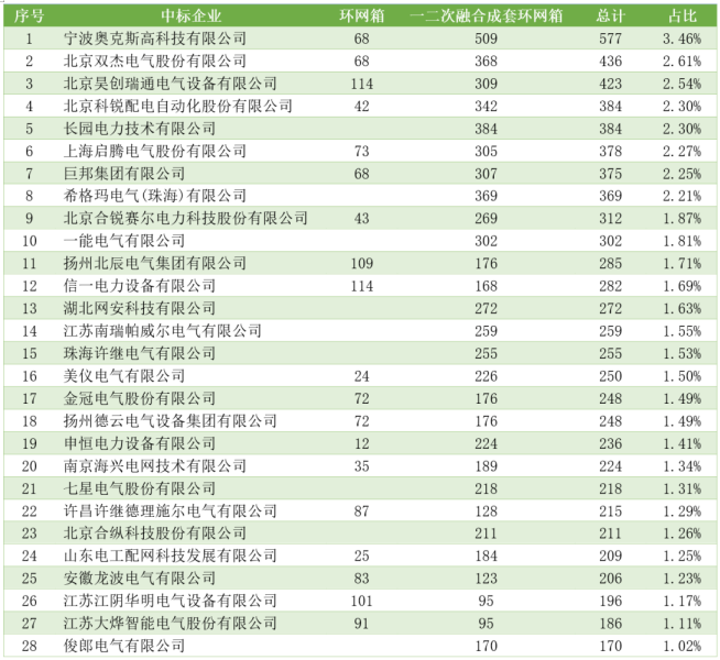 通過環(huán)網箱單獨招標中標的企業(yè)中,北京昊創(chuàng)瑞通電氣設備有限公司和信一電力設備有限公司市場份額占3.31%,共有6家企業(yè)市場份額在3%以上。