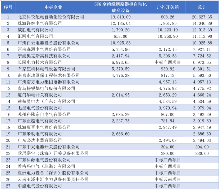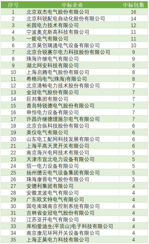 總體中標數量方面,北京科銳配電自動化股份有限公司中標金額達到約2億元;另有4家企業(yè)超過約1億元。