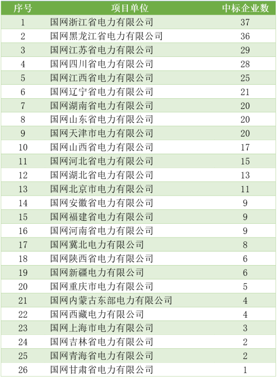 各電力公司中標企業(yè)數量方面,在浙江電力公司共有37家企業(yè)中標,超過10家企業(yè)中標的電力公司共有13個。